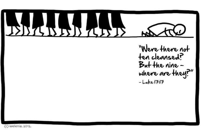 In Luke 17:11-19 Jesus was on His way to Jerusalem and when He reached the border between Galilee and Samaria 10 lepers stood at a distance crying out, “Heal us!” Jesus responded, “Go show yourselves to the priest.” And while on their way, all 10 of them were healed. Of the 10, one of men realized that he was already healed. Overwhelmed with joy and the newfound promise of a future life he stopped dead in his tracks, went back to Jesus, and bowed before Him. Perhaps he remembered that he didn’t do anything to deserve this mercy. All he did was cry out and Jesus heard him. Jesus didn’t have to heal him because He didn’t owe him anything. As it was back then so it is today. Jesus doesn’t owe us anything. However, He loves us despite of our sins and our proclivity to sin. A 100% of the lepers were healed but only 10% went back to give God glory. Jesus said to the one who came back in vv 17-19, “Didn’t I heal 10 men? Has no one return to give glory to God except you? Stand up and go, your faith has healed you!” I don’t know about you but, God has healed me from many wounds and I wanna be like the man who paused to give Him glory. I say to You Lord, that if I have ever forgotten to give You glory, forgive me! I Thank You for everything You have done, for what You are doing, and for what You are getting ready to do for me!