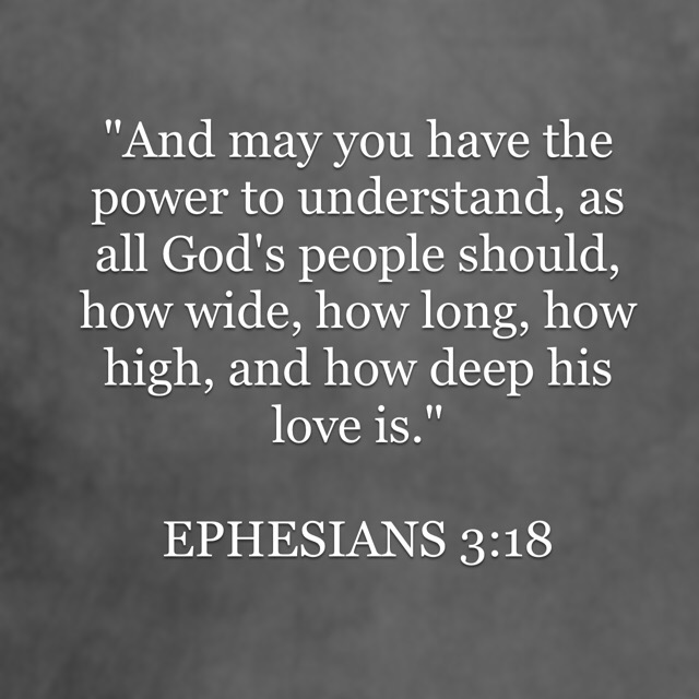 “And may you have the power to understand, as all God’s people should, how wide, how long, how high, and how deep his love is.” (Eph 3:18) This was Paul’s prayer then but does anyone truly understands the width, length, height, and depth of God’s love? I think to start the ‘understanding process’ we would first need to define width, length, height, and depth. According to the Jamieson-Fausett-Brown Commentary, “The “breadth” implies Christ’s world-wide love, embracing all men: the “length,” its being extended through all ages (Eph 3:21); the “depth,” its profound wisdom which no creature can fathom (Ro 11:33); the “height,” its being beyond the reach of any foe to deprive us of (Eph 4:8). Yes for some, God’s love will most likely be an incomprehensible mystery until the day we meet him. But, for now it behooves us to be thankful that He cares enough for us to share His amazing and unconditional love with us!