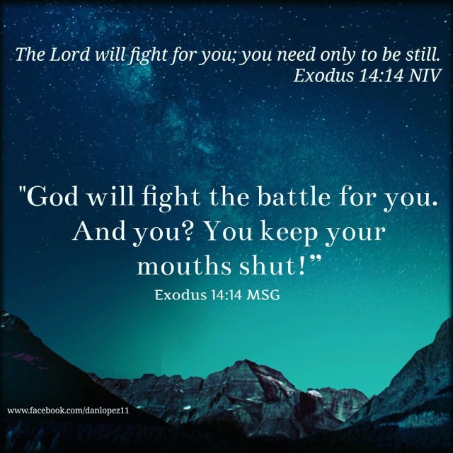 Exodus 14:10-14, “As Pharaoh approached, the Israelites looked up, and there were the Egyptians, marching after them. They were terrified and cried out to the Lord. They said to Moses, “Was it because there were no graves in Egypt that you brought us to the desert to die? What have you done to us by bringing us out of Egypt? Didn’t we say to you in Egypt, ‘Leave us alone; let us serve the Egyptians’? It would have been better for us to serve the Egyptians than to die in the desert!” Moses answered the people, “Do not be afraid. Stand firm and you will see the deliverance the Lord will bring you today. The Egyptians you see today you will never see again. The Lord will fight for you; you need only to be still.” Now, the Message Bible transliteration of V14 is just a tad bit straightforward; “God will fight the battle for you. And You? You keep your mouths shut!”