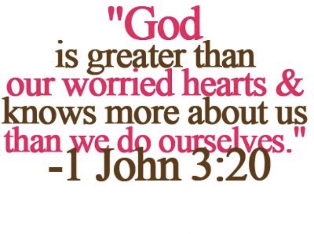 Sometimes your heart can become so desperate that it’s difficult to hear God’s voice. You yearn for _________(FITB), but the lies and fear circling in your head and heart are so loud, it’s difficult to distinguish the voice of God from the enemy. Together (lies & fear) they try to convince you that you will never be enough and that God can never use you. Well, I am a living witness that God is greater than your worried hearts and knows more about you than you do yourselves (I John 3:18-20)! I know that life can be difficult however; it’s incumbent on us to remember that our trials are temporal and God’s love for us is eternal. Yes and glory to God because we are chosen, righteous, holy, marvelous, and deeply and immensely loved with mercies that are brand new everyday! So, today if your heart condemns you and fear is overwhelming you remember God IS greater than your heart and the light of His love drives out all fear. He does this, even though He knows everything you’ve done, all you’ve ever thought, and all you ever will do in the future.