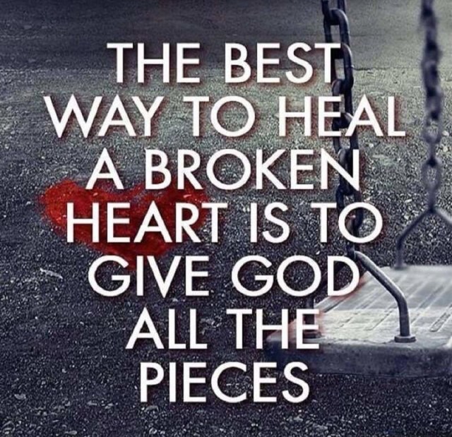 If someone or something has broken your heart make note: the best Way to heal a broken heart is to give God all the pieces! I Peter 5:7 says, “Cast all your anxiety on him because he cares for you.” Charles Spurgeon reminded us that, “There are many sorts of broken hearts, and Christ is good at healing them all.” God is the only Physician who can fully heal a broken heart, and He has never failed in his ability to heal. QOTD: Have you ever experience worshipping God with a broken heart?? Well, if you haven’t you need to certainly try it because sex, drugs, nor alcohol can do what God is able to do in the crux of your pain. You see, worship places your pain in its rightful place — under the reign of an already victorious Father! So today, let your heartfelt praise and worship remind you of God’s great love and absolute sovereignty, and let these reminders bring healing to your broken heart. I have heard it said, “Worship is a balm for even the deepest of wounds!”