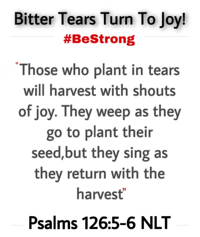 O Lord, help them to be strong in their season of tearful sowing because it’s getting ready to end; and as it is written, declared and promised in Psalms 126:5-6, their time of joyful harvesting is right in front of them!! In Jesus’ turning bitter tears into joy name, amen and amen!