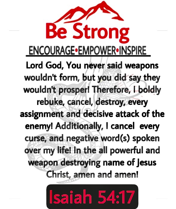 Our boldness and confidence rests solely upon the ‘YES’ and ‘AMEN’ promises of our all-powerful God (2 Cor 1:20), who reminds us throughout His Word, that He is the Almighty, Sovereign Ruler of the universe (known and unknown), and He has given us His assurance that no weapon… whether physical or spiritual, will prosper against His eternal blood-bought children (Isaiah 54:17).