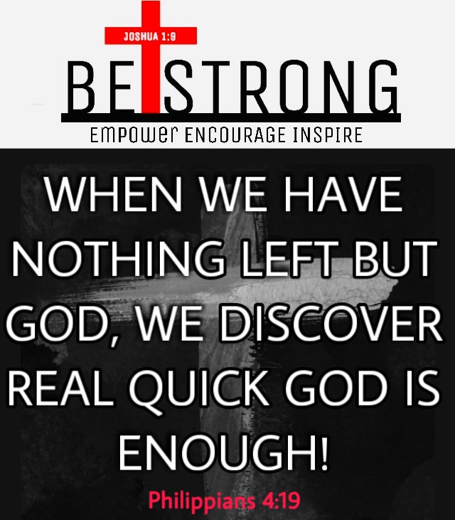 If you can relate to any of these ‘is God enough’ examples, I want you to know that YES HE IS! Nothing here on earth is guaranteed. If you lost everything, You’d be okay because nothing or no thing can take away God’s love for you in Christ Jesus (Romans 8:38-39). Whether you live in a mansion on a hill or a shack in the swamp, Jesus is with you! Whether the world is for you or against you, Jesus is with you! Whenever life knocks you down, get on your knees and you will find Jesus.