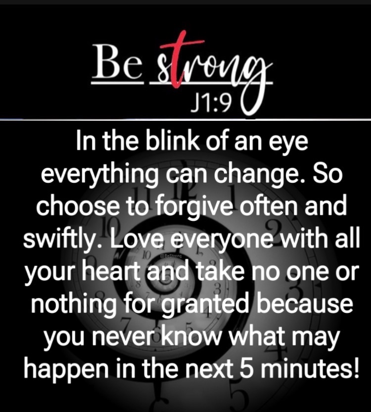 My brothers and sisters, we are all in need of community because in the blink of an eye everything can change. So choose to forgive often and swiftly. Love everyone with all your heart and take no one or nothing for granted because you never know what may happen in the next 5 minutes more or less tomorrow!
