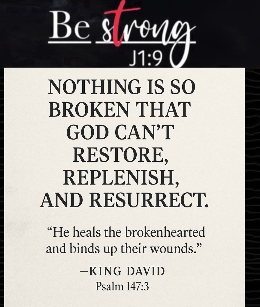 Father God, Thank You for being the One who heals the brokenhearted and binds up every wound, just like You did for David. I bring You my broken places—not to hide them, but to surrender them. Restore what’s been lost, replenish what’s been drained, and resurrect what I thought was dead. Make beauty from these ashes, Lord. I trust You with every shattered piece. In Jesus’ name I pray, believe, receive, and praise.