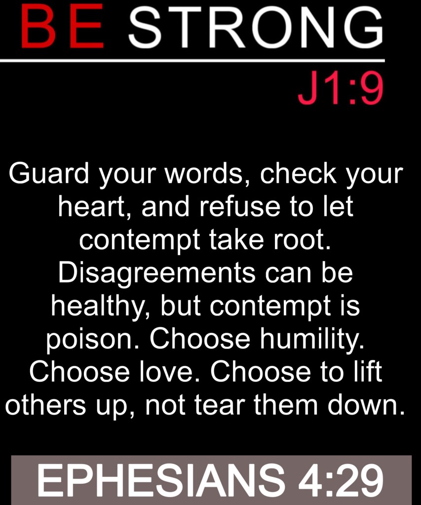So Beloved, guard your words, check your heart, and refuse to let contempt take root. Disagreements can be healthy, but contempt is poison. Choose humility. Choose love. Choose to lift others up, not tear them down.